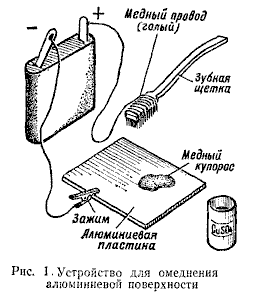 Медный провод находится в щетине зубной щетки так, чтобы провод не касался поверхности алюминия во время трения щетины (омеднения) поверхности детали. Через некоторое время на поверхности алюминиевой детали оседает слой красной меди, который после промывки и сушки лудят обычным способом (паяльником) .
