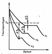 Степень переохлаждения зависит от скорости охлаждения жидкого металла. С увеличением скорости охлаждения понижается фактическая температура кристаллизации и, следовательно, возрастает степень переохлаждения. Процесс кристаллизации можно описать с помощью кривых охлаждения, построенных в координатах «температура — время» (рис. 3). Охлаждение в жидком состоянии сопровождается плавным понижением температуры (участок 1 кривой охлаждения), при достижении температуры кристаллизации на кривой охлаждения появляется горизонтальная площадка (участок 2 кривой охлаждения), т.е. охлаждение (понижение температуры) останавливается. Это вызвано тем, что отвод тепла компенсируется выделяющейся в процессе кристаллизации скрытой