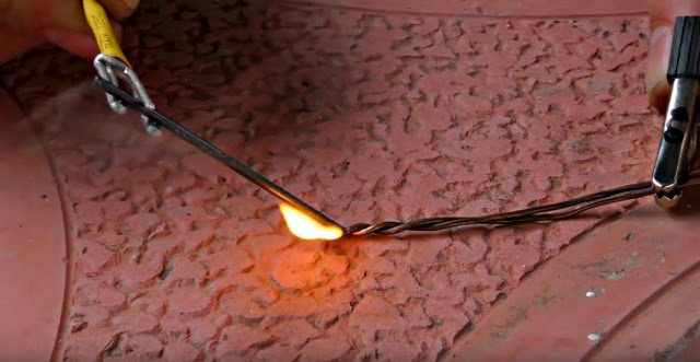 - Поднести горящий конец (это похоже на бенгальский огонь) к месту соединения и прижать. Удерживать в этом положении около трех секунд для достаточного прогрева.