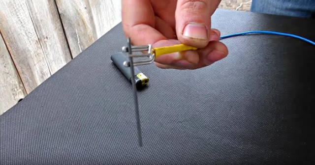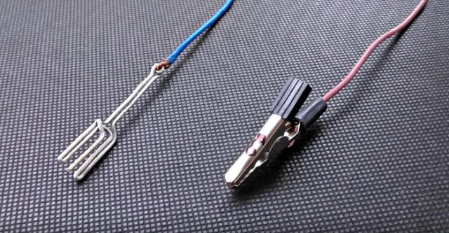 Делаем импровизированные клеммы. Крокодильчик для общего провода, а самодельный крючок из проволоки для электрода.
